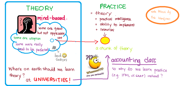 Kemarin aku ketemu Pak Wardjono. Beliau cerita apakah kita semestinya belajar teori atau praktik di kelas. Ini dia ceritanya… 😀