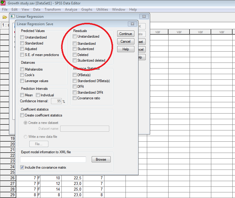 - Sebelum meregresi, jangan lupa save residuals. Ini memungkinkan anda langsung memperoleh nilai error (i.e. akrual diskresioner) tanpa harus menghitung ulang. Anda, tentu saja, hanya akan memperoleh akrual diskresioner observasian normal. (Penting: Langkah ini hanya boleh dilakukan bila model untuk mencari koefisien sama dengan model untuk mencari akrual diskresioner. Apabila ada perbedaan antara kedua model, langsung lanjutkan ke langkah 4 untuk seluruh observasian, perusahaan-tahun.)