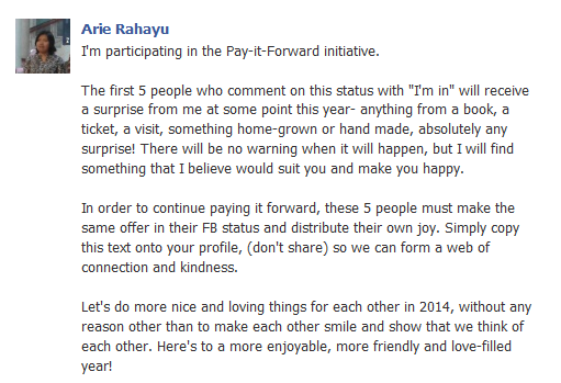 Yang menarik, baru kusadari bahwa ternyata ‘Pay-It-Forward Initiative’ ini juga jadi alasan buatku untuk berbuat baik sama teman. Kalau nggak ada inisiatif ini, mana mungkin aku ngasi kado ke temen cowok yang komen di statusku. Masak nggak ada apa-apa koq ngasi kado? Malu lah.