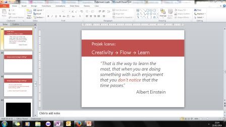 Alhasil aku jadi sungguh bersemangat! Mulailah aku menyusun presentasi untuk mengajar pertemuan pertama, 10 Februari lalu. Di dalam presentasi kuselipkan cerita mengenai pemilihan model mengajarku beserta alasannya plus hal-hal ideal yang mendasari pemilihan model tersebut. Ada beberapa hal ideal yang kusampaikan, antara lain soal menjadi kreatif, flow, dan menghasilkan karya yang bagus. Asumsi dasar dalam projekku ini tentu saja adalah berani mengambil risiko dan bekerja keras, hanya dengan keduanya orang bisa belajar menjadi kreatif.