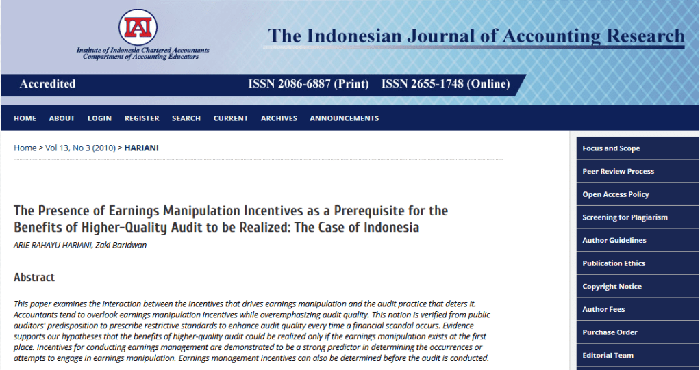 Sebelum terbit di IJAR, artikel ini juga memperoleh best paper award kategori internasional di Simposium Nasional Akuntansi (SNA) XIII